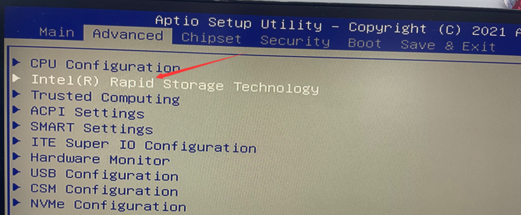 - In the BIOS, select Chipset > PCH-IO Configuration > SATA and RTS Configuration > Set the “SATA Mode Selection” to “Intel RST Premium with Intel Optane System Acceleration.” > Press the Esc key on the keyboard to exit the current page. Finally, select “Save & Exit.”