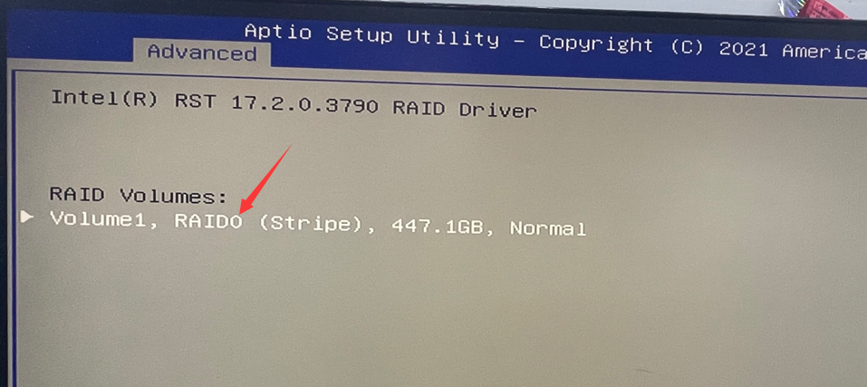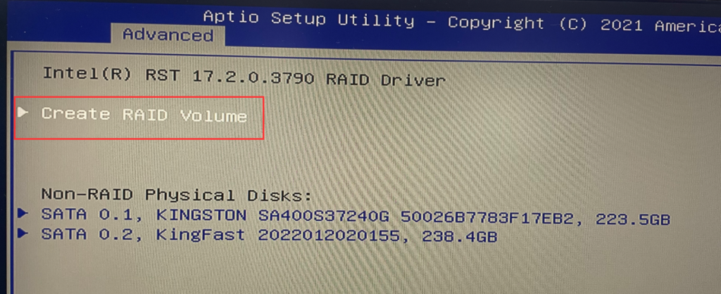 3. After restarting, quickly press the Del key to enter the BIOS. Select “Intel(R) Rapid Storage Technology” > “Create RAID Volume” > RAID level, such as RAID 0, RAID 1, or RAID 5 (Note: RAID requires at least three SATA hard drives for setup). In this tutorial, we will use RAID 0 as an example, but you can choose according to your needs. Select the disks by using the spacebar and then click “Create Volume.”