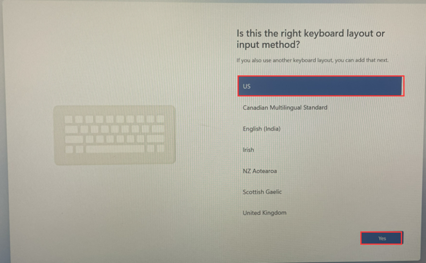 After the final restart, you’ll be guided through the Windows 11 out-of-box experience. First, select your region and keyboard layout. You can add a second keyboard layout if needed, or skip this step for now.