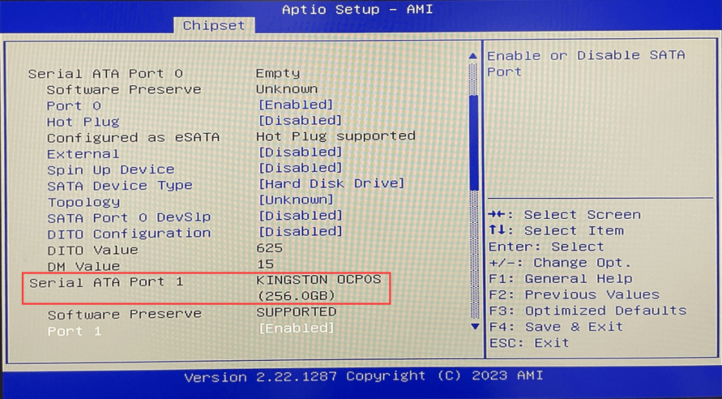 Use the keyboard arrow keys to move to Serial ATA Port 1 to find the hard disk name and capacity.