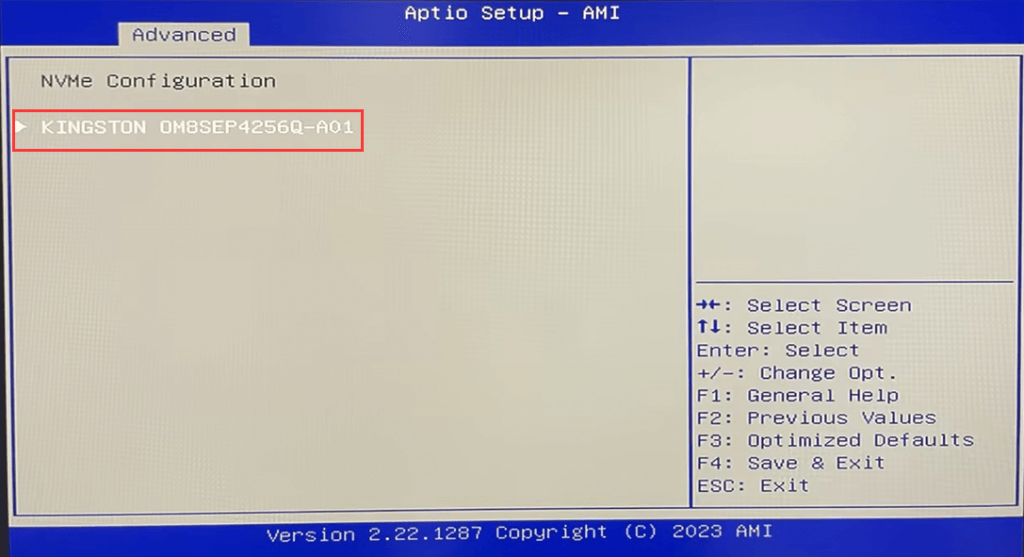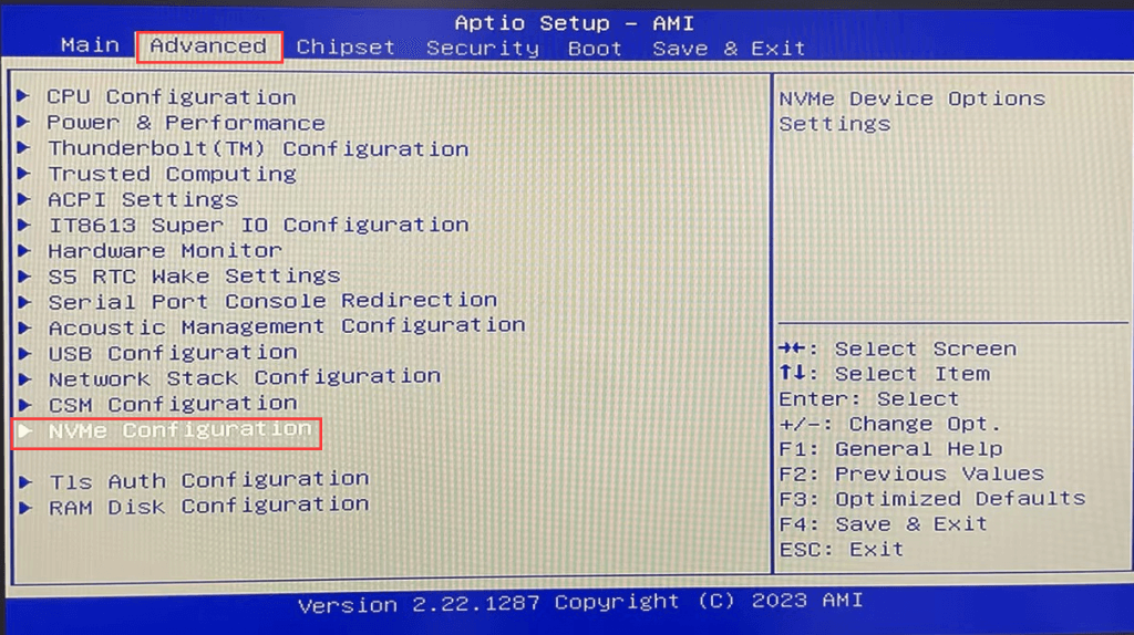 Follow the steps in Step 1 to enter BIOS Setup, and select Advanced>NVME Configuration> to query the NVME SSD;