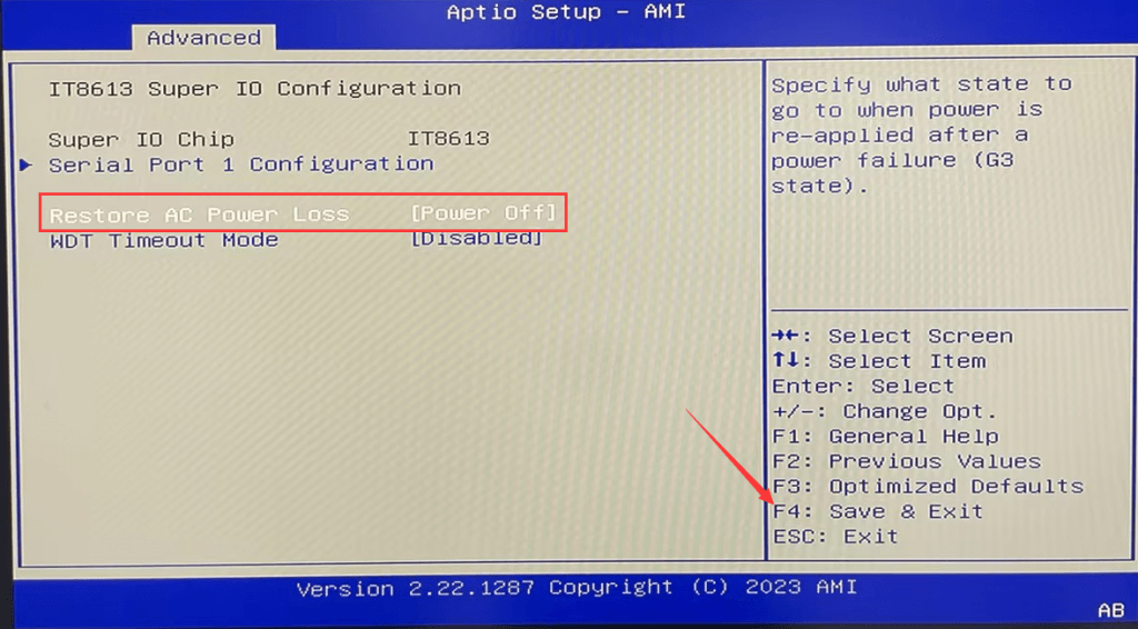 After entering BIOS, select Advanced>IT8613 Super IO Configuration>Restore AC Power Loss and configure it as [Power off].