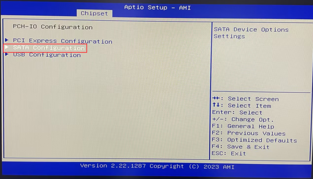 Follow the steps in Step 1 to enter BIOS Setup and select Chipset>PCH-IO Configuration>SATA Configuration in order.