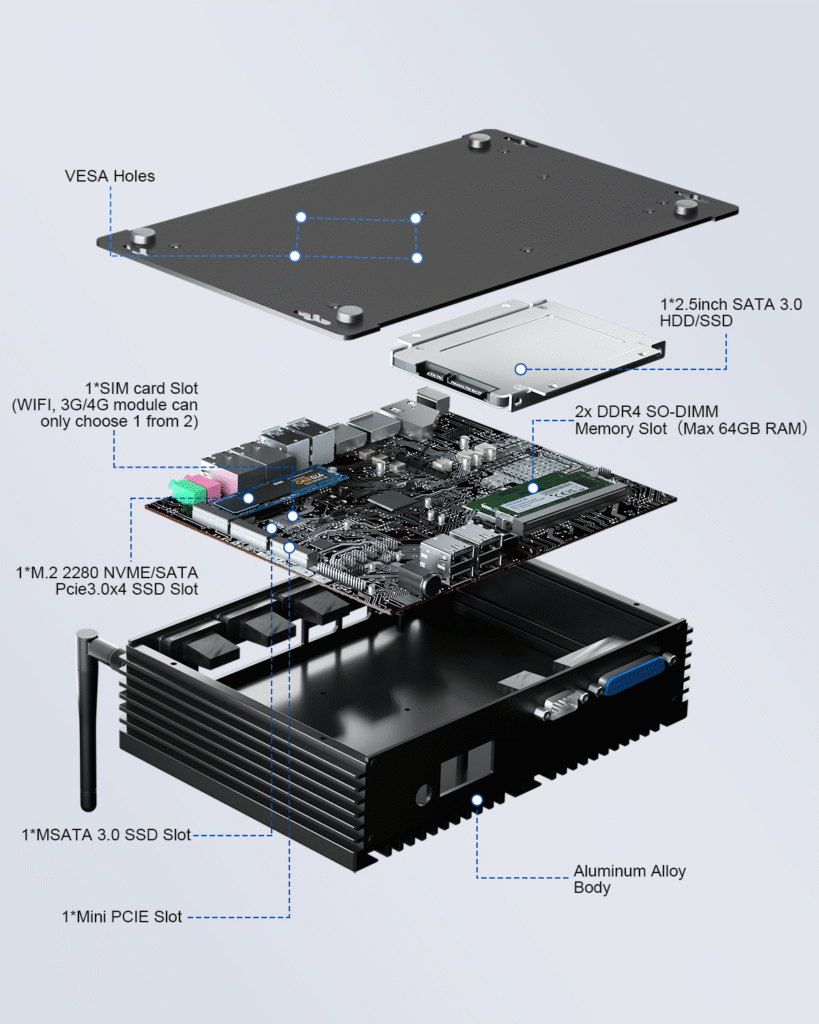 - Memory: 2×DDR4 SODIMM slots (max 64GB)
