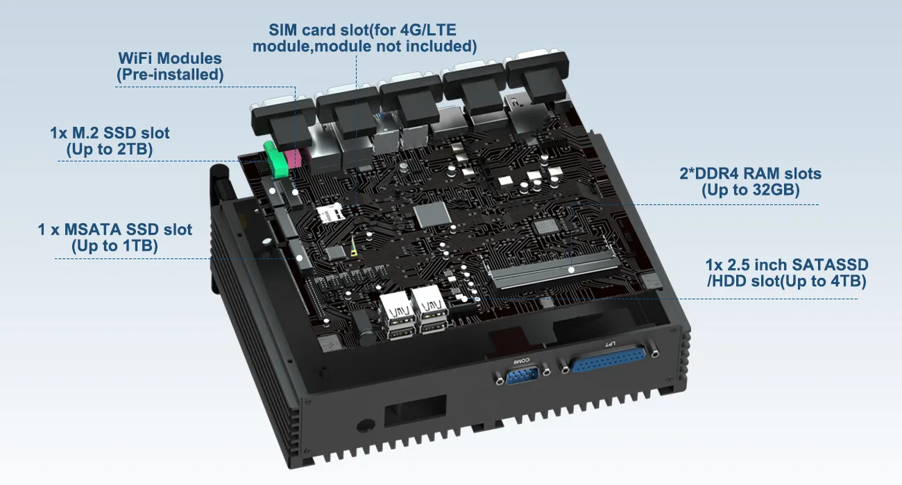 Supports simultaneous installation of 1 M.2 NVMe/SATA SSD, 1 mSATA SSD, and 1 2.5-inch SATA HDD/SSD for scalable storage capacity. Additionally, it features an M.2 E-key slot (for WiFi/Bluetooth modules) and a Mini-PCIe slot (for 4G modules) to accommodate diverse wireless connectivity needs.