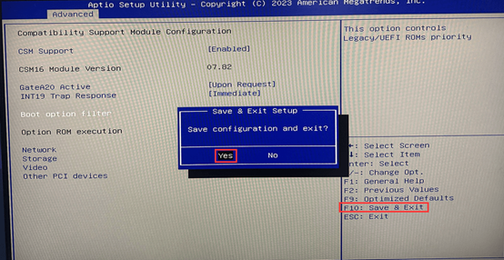- After the configuration is complete, press F10>Enter to select Yes to save and exit.