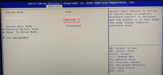 - Restart the process of rapid keyboard Del key into the BIOS, query Secure Boot is successfully activated, as shown in the figure below. Secure Boot has been successfully activated.;