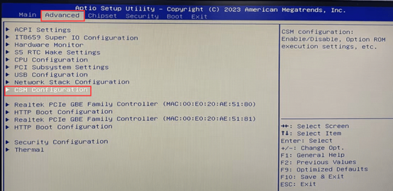 4. At this time, the computer will restart. Again, hit the keyboard Del key to enter the BIOS Setup, in turn, select Advanced > CSM Configuration > CSM Support will be configured as [Enabled]. After the configuration is complete, press F10 > Enter to select Yes to save and exit.