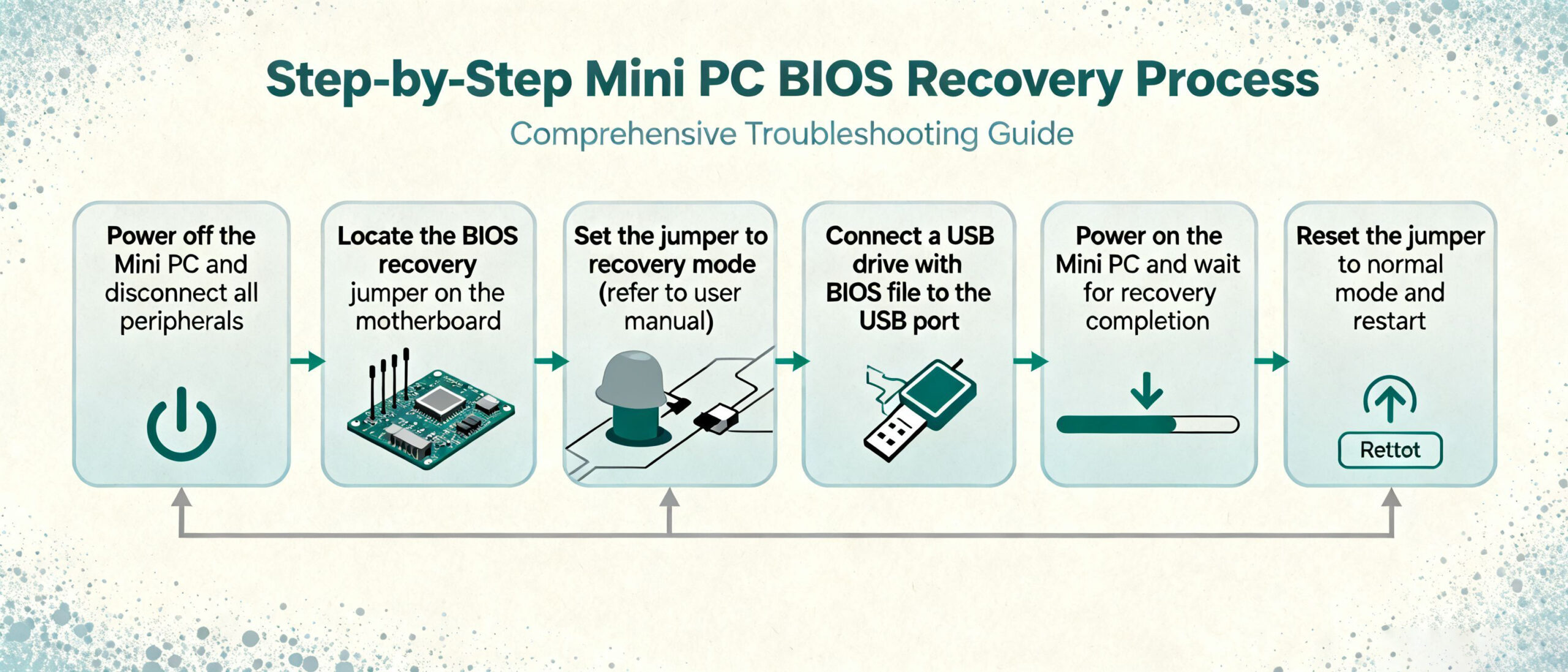 When a failed firmware update renders the system unbootable, follow this recovery procedure: First, connect a programmer to the motherboard’s reserved BIOS recovery port (typically USB pins). Then use the manufacturer’s dedicated tool to flash the original firmware image. For Mini PCs supporting dual BIOS, activate the backup firmware partition via the hardware switch. To mitigate such risks, consult the Mini PC firmware update guide prior to updating to ensure the official firmware is used.